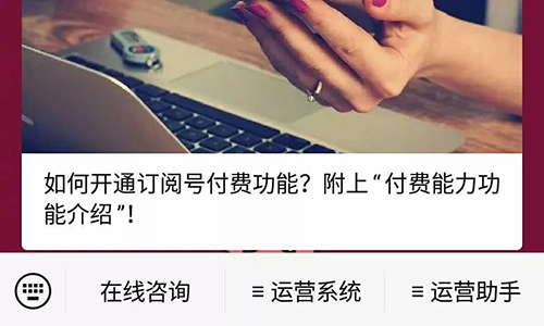 1、自定義菜單介紹訂閱號(hào)可以在會(huì)話(huà)界面底部設(shè)置自定義菜單,菜單項(xiàng)可按需設(shè)定,并可為其設(shè)置響應(yīng)動(dòng)作。用戶(hù)可以通過(guò)點(diǎn)擊菜單項(xiàng),收到您設(shè)定的響應(yīng),如收取消息、跳轉(zhuǎn)鏈接...